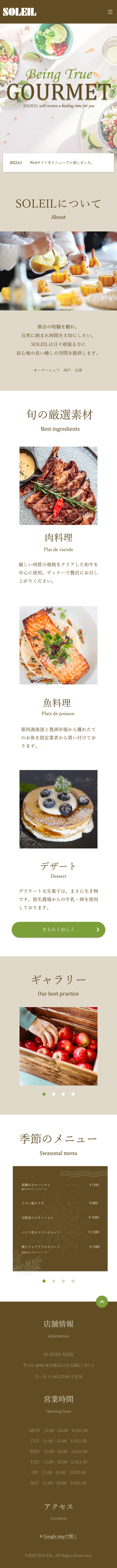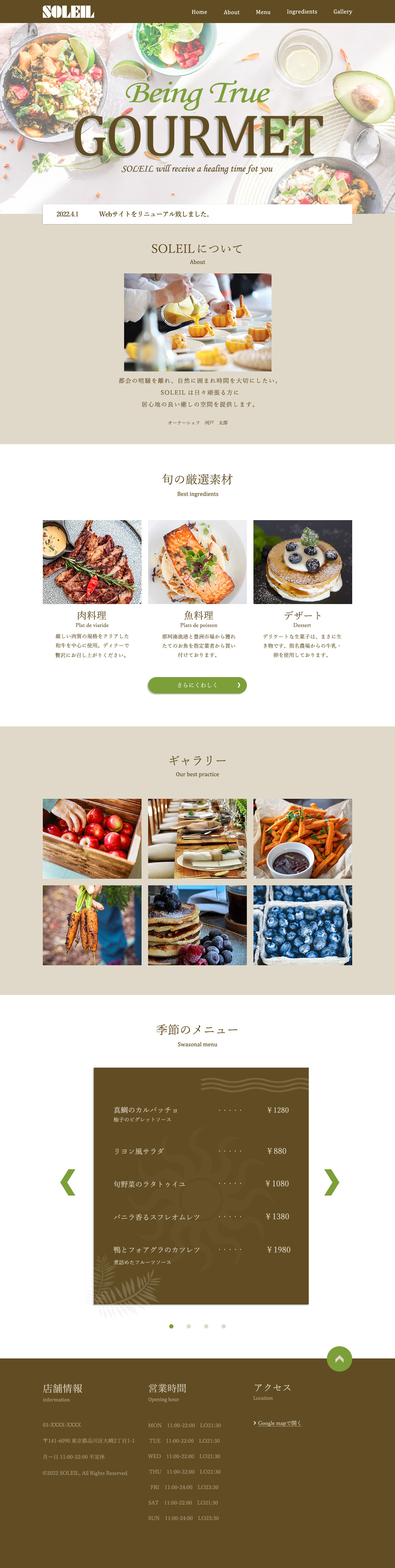 - レストランのWebサイトを模擬して制作いたしました。トップページのみの制作となります。柔らかで落ち着いた印象を与えるためにブラウンをベースに使用しています。オーガニックな野菜のイメージを想起できるようにアクセントカラーにはグリーンを使用しました。落ち着いていて大人な印象の女性がメインターゲットのため、サイト全体もシンプルにまとめました。