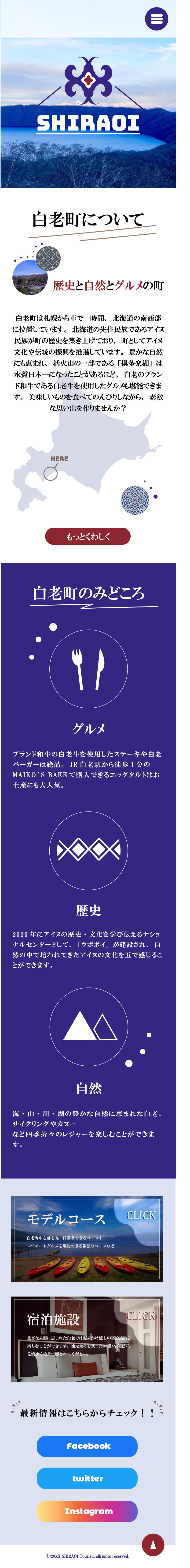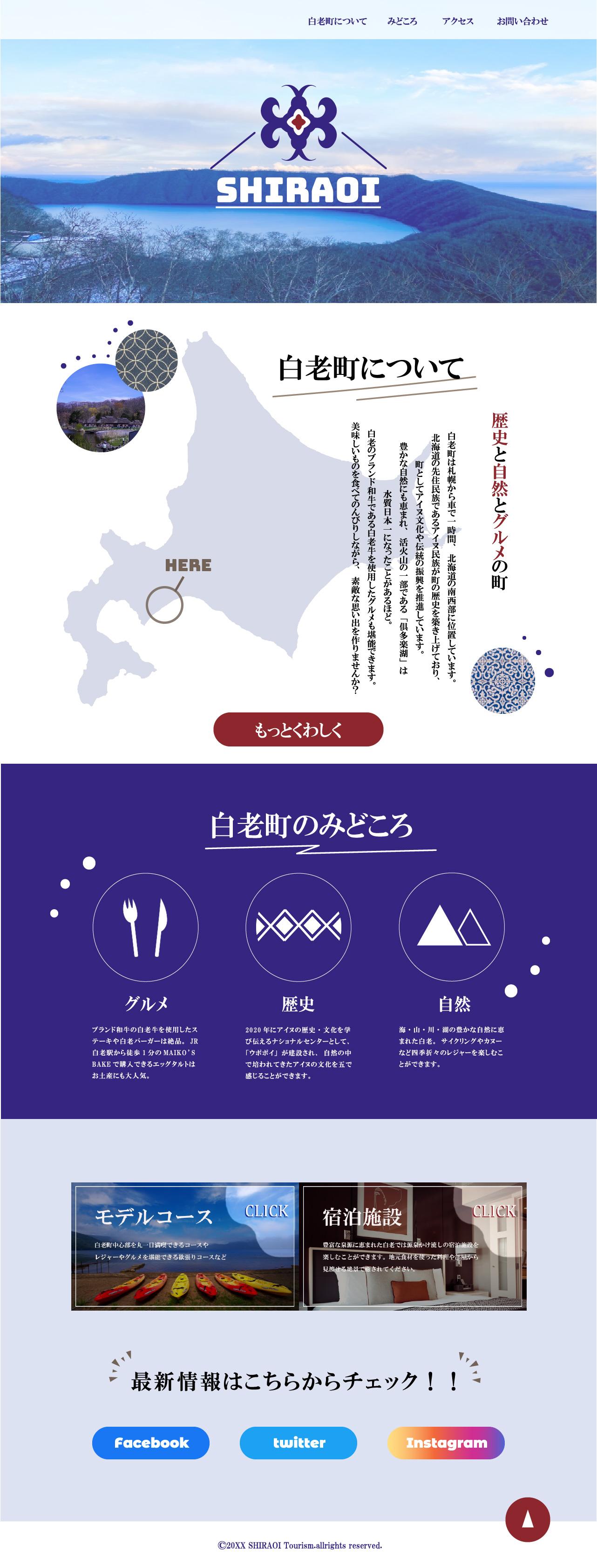 - アイヌ文様を想起させるように円や三角形など、シンプルな図形を組み合わせてサイトを構成。カラーリングもアイヌっぽく。かつ寒色を使用することで落ち着いた雰囲気と海や湖などの自然を表現。